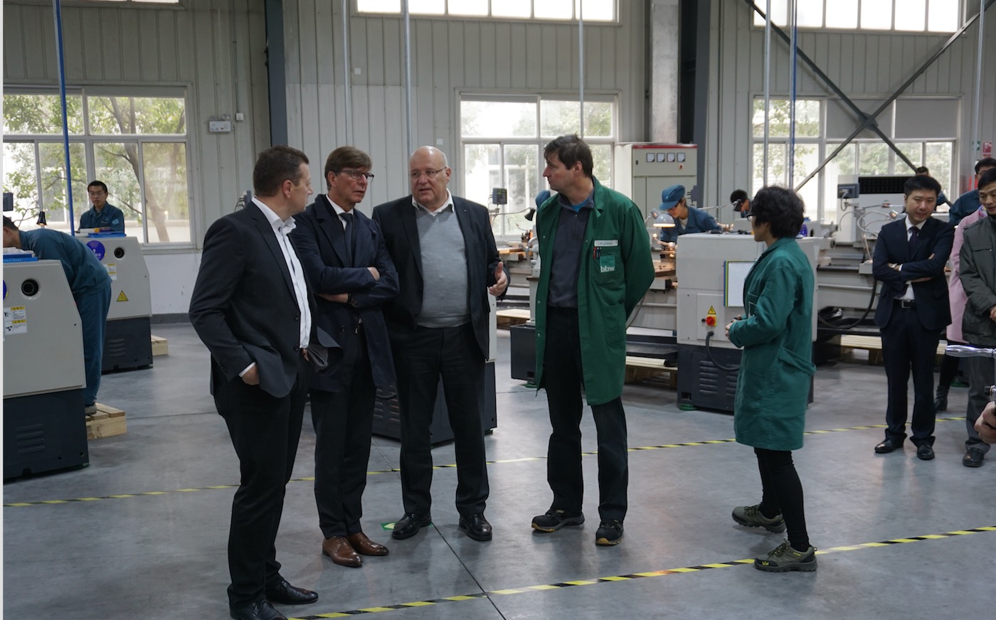 11月29日,德國萊比錫工商業(yè)聯(lián)合會(IHK)主席Kirpal先生及總經(jīng)理Hofmann博士來到江蘇,首先參觀我方和德國bbw教育集團的中德合作項目-江蘇無錫公共實訓基地的bbw學習型工廠,對我們完全按照德國標準設計規(guī)劃的教學場地以及嚴格貫徹德國雙元制教學大綱和實訓標準的教學過程表示贊許,在看到項目學生加工出的作品之后,更是豎起大拇指,表示這才是“德國標準”的高技術人才。